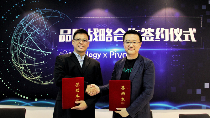 上海斯歌大中华区总裁Tan ChoonNgee(左)与 Pivotal全球副总裁兼大中华区总裁于志伟(右)签约仪式现场合照