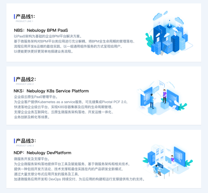 容器云平台(NKS+PKS)、微服务开发及治理平台(NDP)、BPM PaaS(NBP)。