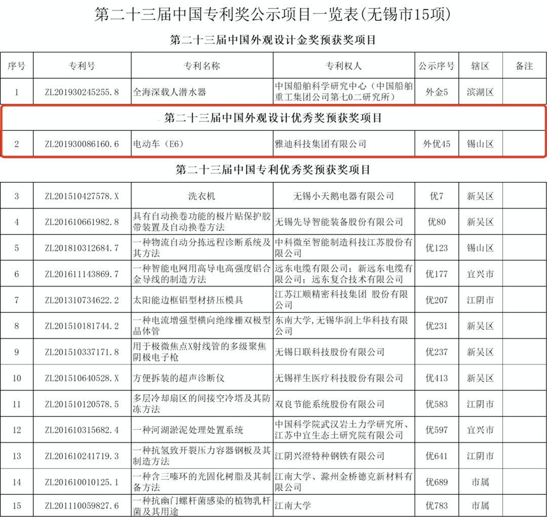 近日,第23届中国专利奖评选结果揭晓,来自江苏无锡的两轮电动车民族品牌雅迪,凭借人气爆款电动车雅迪冠能E6斩获“第二十三届中国外观设计奖”。 据了解,此次获奖的雅迪冠能E6在车体和软件系统设计上有多处创新,包括悬浮式设计大灯、集成仪表无缝融合车身、摇臂处全铝合金材料应用等,在营造高质感的同时,也能保证车身轻量化,为用户出行带来舒适的灵感与体验。