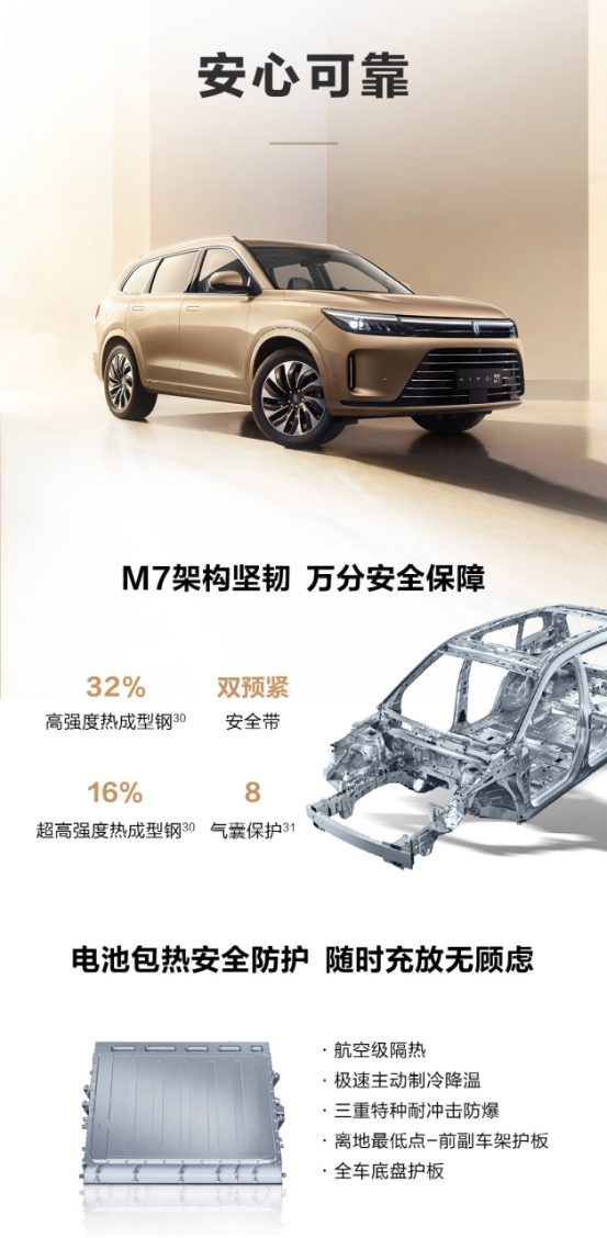 ØPack系统级防护 :AITO问界M7电池组采用阵列式防火墙结构,新增空气垫装甲防护技术,拥有三重特种级耐冲击防爆、航空级隔热和纳米防拉弧设计特性,同时全车底盘护板(发动机舱、电池包、油箱等)和极速主动制冷降温系统,更能全方位防护每一颗电芯。