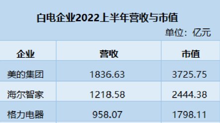从2022年上半年财务数据来看,美的集团、海尔智家、格力电器营业收入分别为1826.61亿元、1218.58亿元、958.07亿元,同比增长5.09%、9.1%、4.58%。