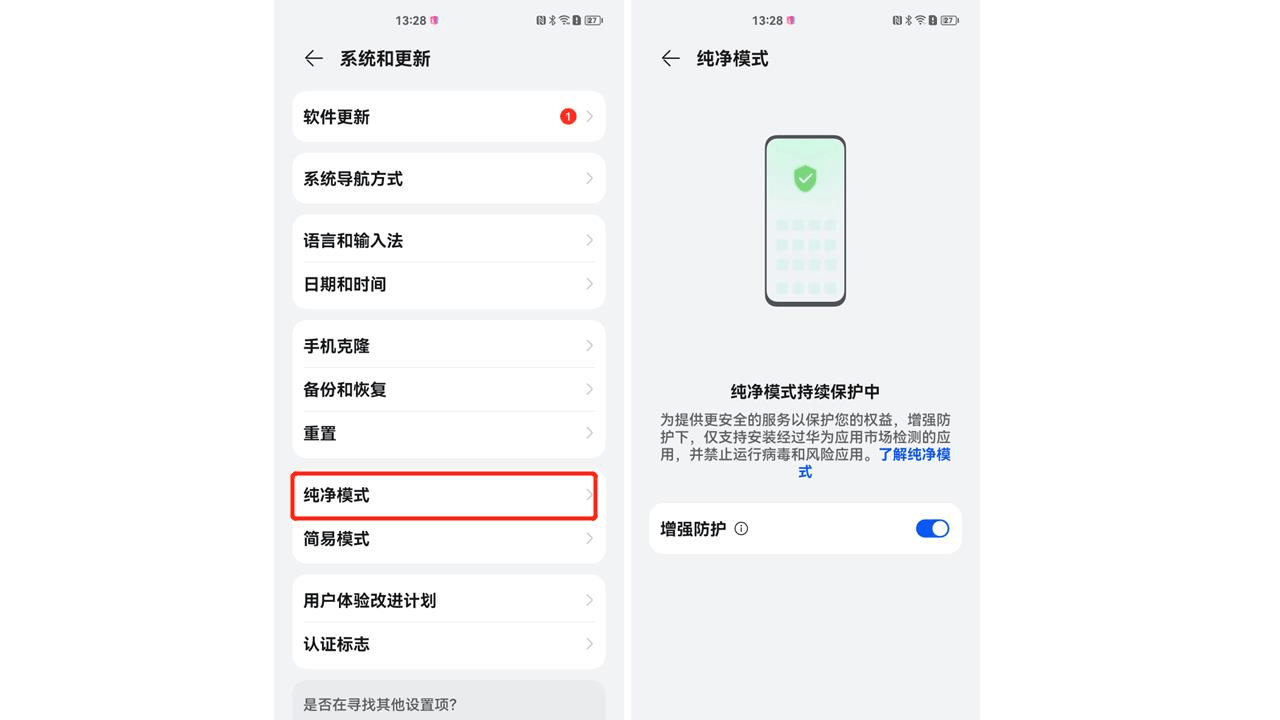 在设置 > 系统和更新 > 纯净模式 > 增强防护选择开启后,系统将加强应用安全管控,未通过华为应用市场安全检测的应用将无法安装,已安装但检测出存在风险的应用将无法运行,有效避免长辈、儿童等受到恶意或病毒的应用侵扰,守护个人隐私和数据安全。简单理解就是,增强防护功能为长辈、儿童等辨别或防护能力较弱的人群构筑了一张“安全防护网”,在防护网内使用手机上网将变得更加安全。